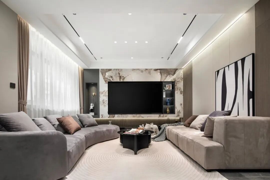 如果客厅空间较大,且沙发是围合式摆放的,那么可以选择一块更大尺寸的地毯,能够完全覆盖沙发所围成的区域,使整个客厅的焦点更加集中。