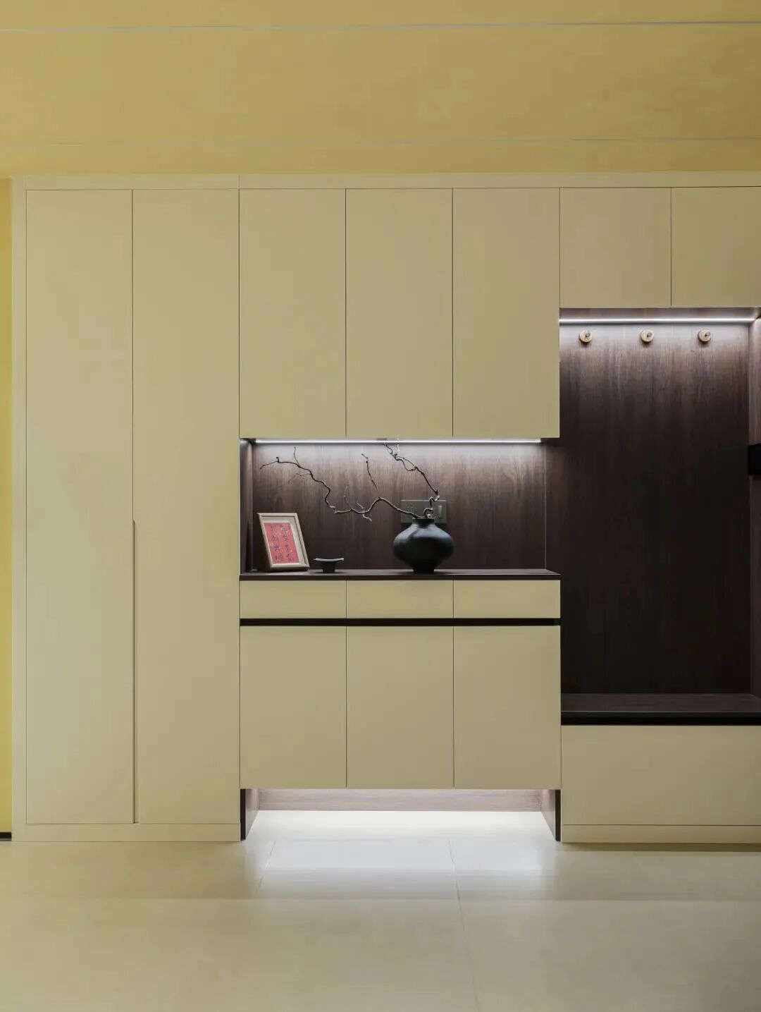 ★ 收纳型玄关中部底部留空 定制玄关柜做一柜到顶,中部留空进门放钥匙手机等小杂物,底部留空放当天换下来的鞋,功能性拉到最大。